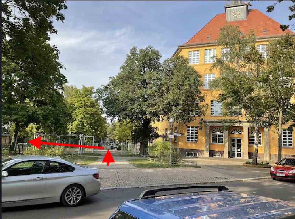 Als Anhang ein Bild. Mangels Weitwinkel sieht man nur die Schule und das Tor, aber nicht den Container. Man geht durch das Tor und sieht dann gleich links hinter einem grünen Zaun mit Tor den Container.